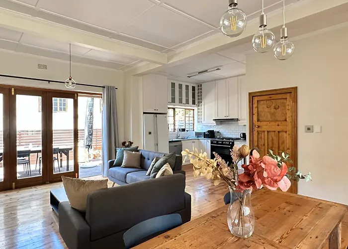La Villa Stylish Edwardian Townhouse With Mountain Views Ciudad del Cabo está situada a 25 minutos a pie del Museo del Distrito Seis, lo que permite acceder a varios puntos turísticos cercanos. Esta casa de vacaciones, que se encuentra a una distancia de 2 km de la Catedral de St. George, ofrece la posibilidad de practicar bolos.